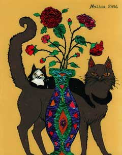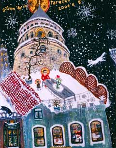 GEÇMİŞ SERGİLERİMİZ GELECEK SERGİMİZ - DEVAM EDEN SERGİMİZ - NEVİN İŞLEK & MEHLİKA BAŞ RESİM SERGİSİ 15 Kasım-3 Aralık 2005 İkiz çocuk annesi Nevin İşlek , kendisi gibi resme yönelmiş kızı Mehlika Baş ile, “Ana-Kız” ortak sergisi olarak galerimizde ikinci kez resim severlerin karşısına çıkıyorlar… 1936 yılında Tekirdağ’da doğan Nevin İşlek , ilkokulda “küçük ressam” diye çağrılırken, yaşamına öykü, resimden önce girmiş. Yazdıkları, Varlık ve Dost gibi edebiyat dergilerinde yayınlanmış. Eğitimini lisede terk eden İşlek, bu nedenle Akademi’ye gidememiş ama resmide hiç bırakmamış. LCC’de Bedri Rahmi’nin derslerine devam ederek tekniğini geliştirmiş; Bedri Hoca’nın yüreklendirmesiyle yoluna hızla devam ederek özgün yorumuyla ürettiklerini,1965’ten başlayarak , seyrek de olsa sanatseverlerle paylaşmış. İşlek’in resmini, “Disiplinler arası yaklaşımın güzel bir örneği” olarak niteleyen Yazar Murat Mıhçıoğlu ,böylece sanatçımızın gerçekleri masala dönüştürürken kullandığı dilin zengin kaynağını da açıklamış oluyor. Bedri Rahmi’nin “Sergilesek olay olur reis!” dediği , kendisinin “Görev gibi değil , seyretme ve tanıklık etme dürtüsüyle” çalıştığını söylediği resminde sanatçımız, farklı teknikler kullanmaktadır: Tual üzerine akrilikle birlikte karşımıza çıkan beklenmedik malzemeler ve 20. yy ‘da yaygınlaşan bir halk sanatımız olan CAMALTI TEKNİĞİ’ni geliştirerek ele aldığı uygulamalar… 1971’de İstanbul’da doğan Mehlika Baş, MSÜ Sinema Tv Enstitüsü mezunu. İlkokul öncesine ait şaşırtıcı resimlerini 1999’da ‘konuk sergi’ düzeniyle Hobi Sanat Galerisi’nde izleyenlerle paylaşmış. Çok severek çalıştığı “camaltı” tekniğini, annesinden öğrenmiş ve geliştirmiş ; böylece izleyenlerinin iyi bildiği “Mehlika gibi” kullanabildiği, onu farklı kılan düzeye ulaşmış. Şimdilerde tual resmine de gönül veren genç Mehlika ürettiklerinde, Geleneksel Türk Halk Resmi’nin gerçeküstücülüğün sınırlarını zorlayan tatlarını kullanıyor; mizahi yaklaşımıyla açıklanabilecek “fettan kedi” gibi figürlerini ,beceriyle uygulayarak,başarıyla yoluna devam ediyor; açtığı sergilerle resimlerini sevenleriyle paylaşıyor…